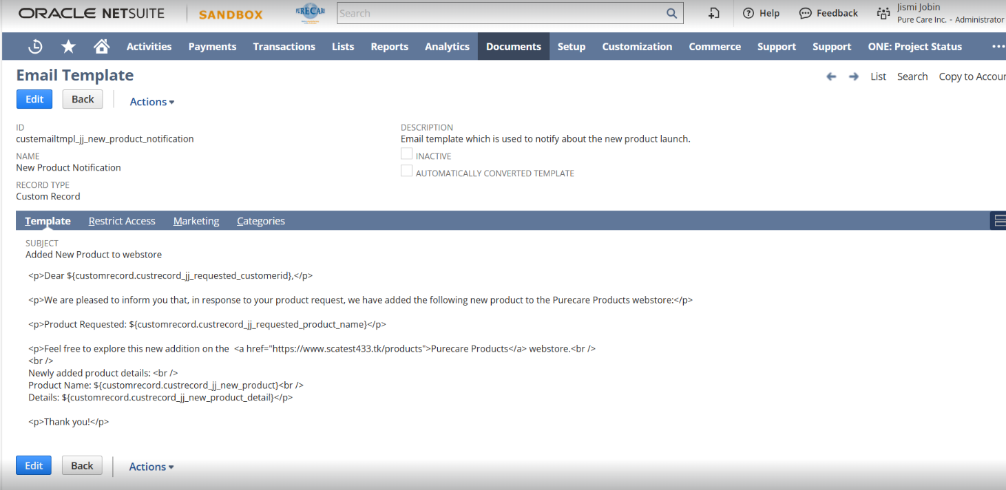Within the custom record, the information provided by the customer is stored. Additionally, appended the customer’s email ID to the custom record created for the new request. Once the request is submitted, an email notification is sent to the client.