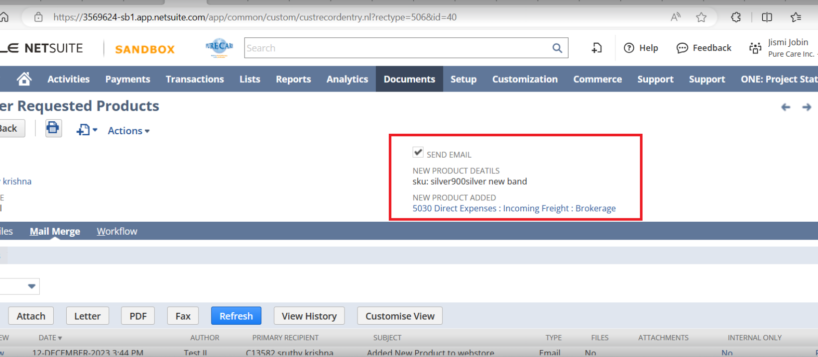 A new email template is created with the new prodcut details from the product request list.