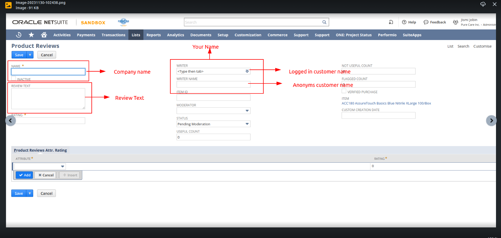 In netsuite item record record product review section . we need to update those fields first . As per website form fields name , I added that fields name screenshot below.