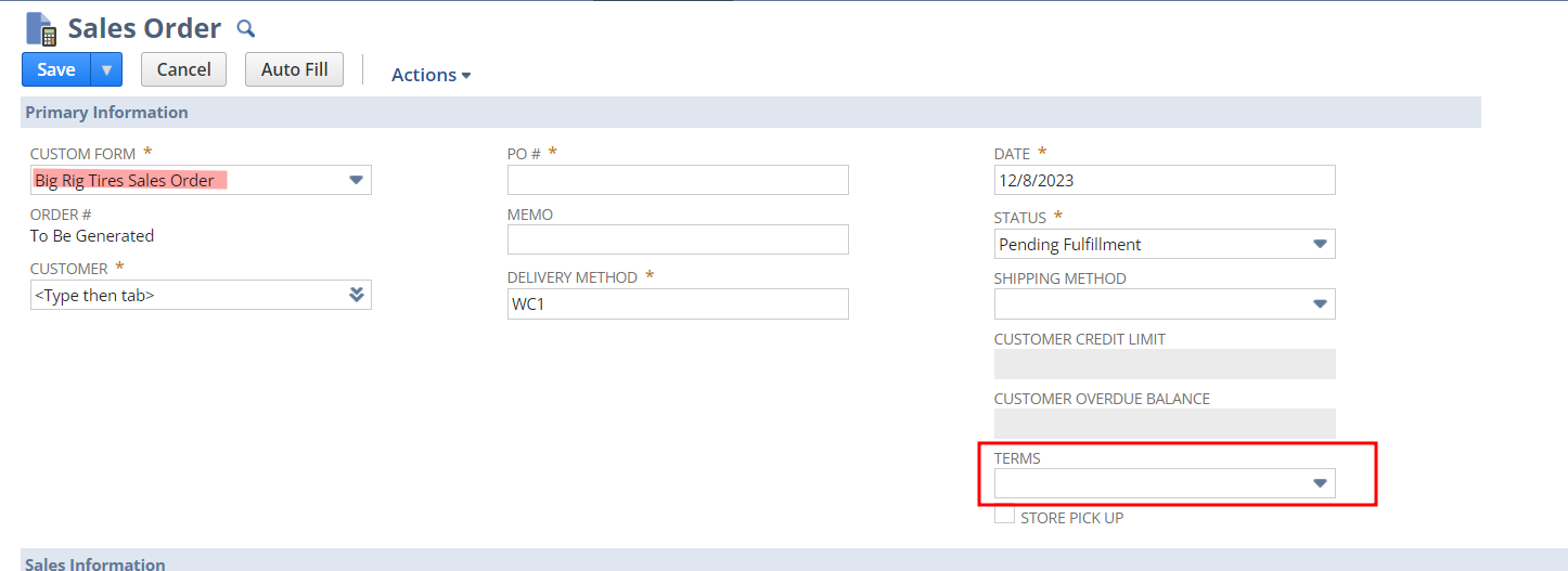 User is needed to move the terms field from the Billing tab to the Main Body fields.